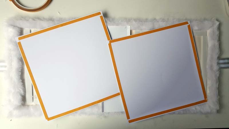 A belső oldalakra szánt papírokat 19 x 19 cm-esekre vágtam, és a szélüket, amik majd a szőrökön rögzülnek, kétoldalassal fedtem be. Senki nem hinné, de állati jól tapad a szőrre és nem is könnyű visszaszedni (én kénytelen voltam, mert úgy ragasztottam rá a belső papírokat, hogy alatta a 3d ragiról elfelejtettem leszedni a fedő papírt 😀 ).
