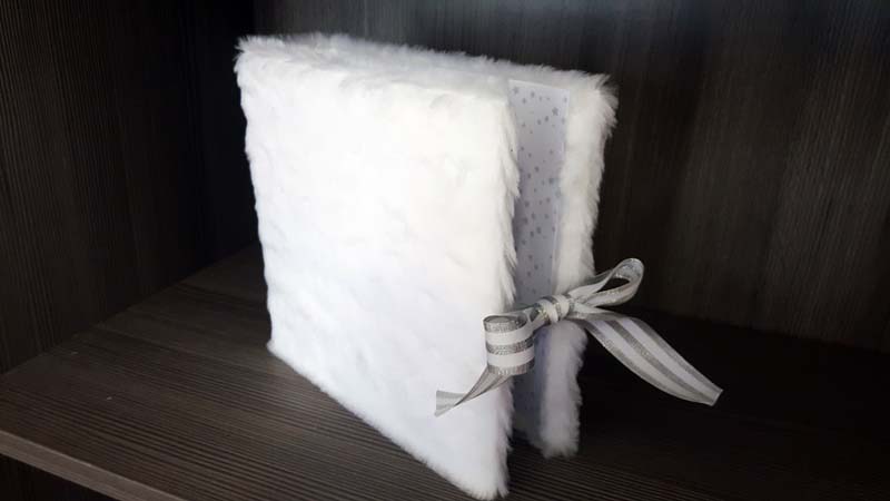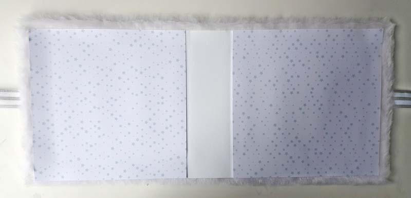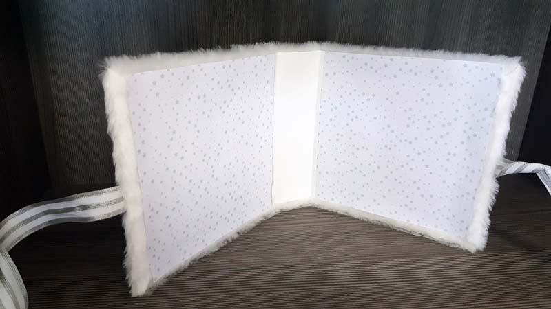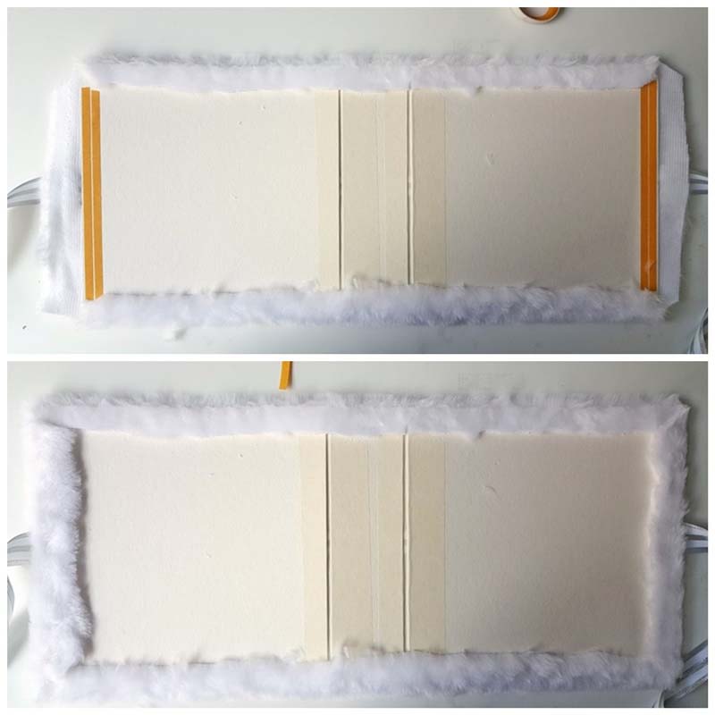 Mivel fedjem be a gerincét belül? Ternészetsen fehér papírral. Vágtam egy szép darabot, kétoldalassal be is ragasztottam. De alul és felül a szőrme rettenetesen felnyomta a papírt, amit így a hajtásvonalnál meg sem tudtam hajtani, mert alul és felül gyűrődött. Letéptem, újra gondoltam. Mert ugye akkor a borító belső felére sem tudok csak úgy egy szép papírt ragasztani. Valamivel meg kellene emelni a belső papírokat, hogy egy szintbe hozzam a szőrme vastagságával.
