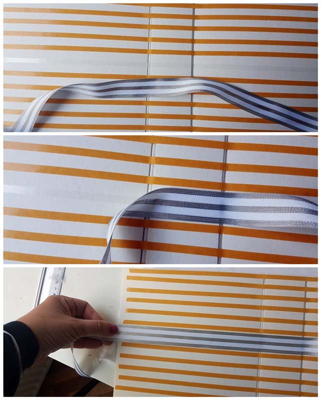Utána a szalagot rögzítettem, ami persze opcionális. Az első próbálkozáskor kihagytam. A középső ragasztócsíkról leszedem a sárga hátulját, a szalagot félbe hajtva megkeresem a közepét, amit szépen kihúzva először középen rögzítem, majd a szalag végét fogva kifeszítem, hogy egyenes legyen, és úgy nyomom rá a ragasztócsíkra!