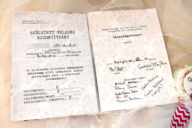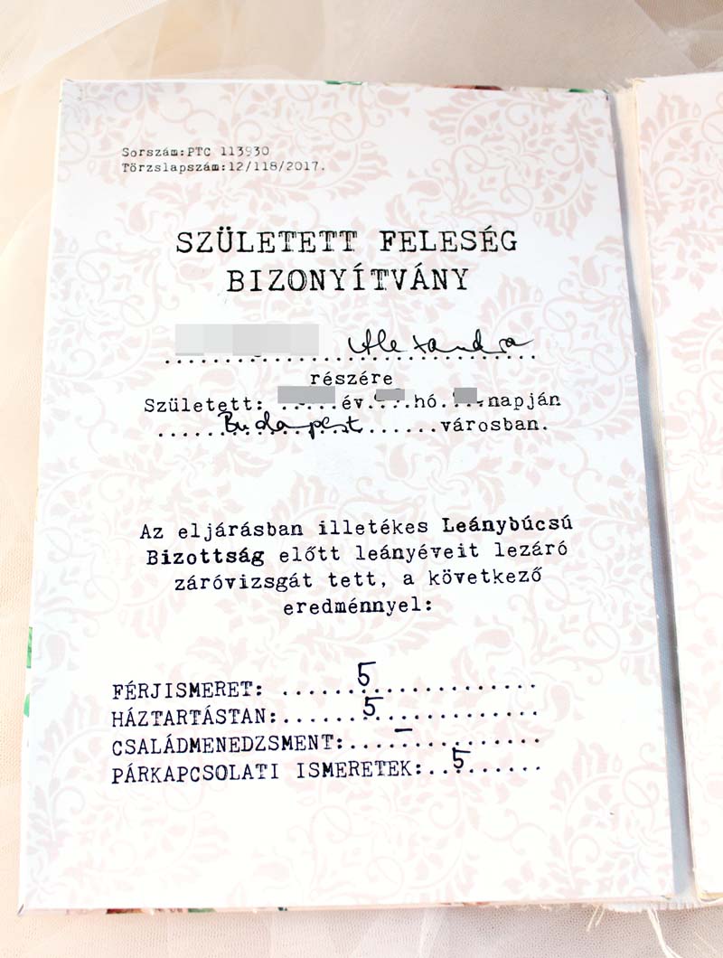 Aztán mikor minden feladatot megoldott, és a nagyesküt is elmondta (idézem: "Ezúton ígérem Nektek Lányok, olyan jó háziasszony leszek, mint az álom! Uramat megbecsülöm, más pasiját elkerülöm. Fodrászaton nem időzök, inkább otthon mosok-főzök. Férjemuram cirógatom, bánatommal nem nyaggatom. Ha csajozik és rajtakapom, sodrófával helyre rakom, Telefonon nem csücsülök órákig, nehogy a számlám elérjen majd Nógrádig. Fogadalmam végén legyen ámen, ráadásul még csak annyi: ááááááá, NEM!!"), akkor ünnepélyesen átadtuk neki a Született feleség érdemrendet és a Született feleség bizonyítványt.
