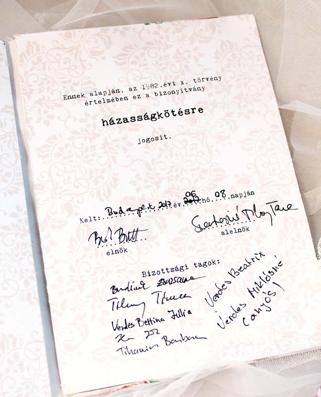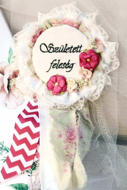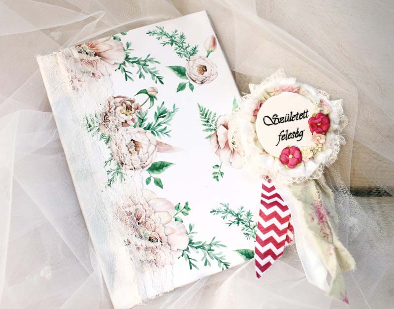 A bizonyítványhoz sörkartont vontam be a (szerintem legszebb) NőiCsizmás esküvői papírral, majd belülre egy szintén NCsD-s papírra nyomtatott szöveget ragasztottam. Persze menet közben kiderült, hogy már az elején elcsesztem, mert az alaphoz a két sörkarton között túl kicsi helyett hagytam, így nem csukódott be rendesen a kis "könyvem", de tudjátok, hogy az ilyen kis hibák miatt nem kezdek újra semmit, egyszerűen ollót ragadok, és gond nélkül vágok. 😀 Most is így tettem, középen elvágtam az egészet, majd kívül a gerincen egy textilcsíkkal és csipkével fogtam össze a két lapot. Csak azért mondtam el ezt ilyen hosszan, hogy Ti ne járjatok úgy mint én, semmiképp. Szívesen. 😉