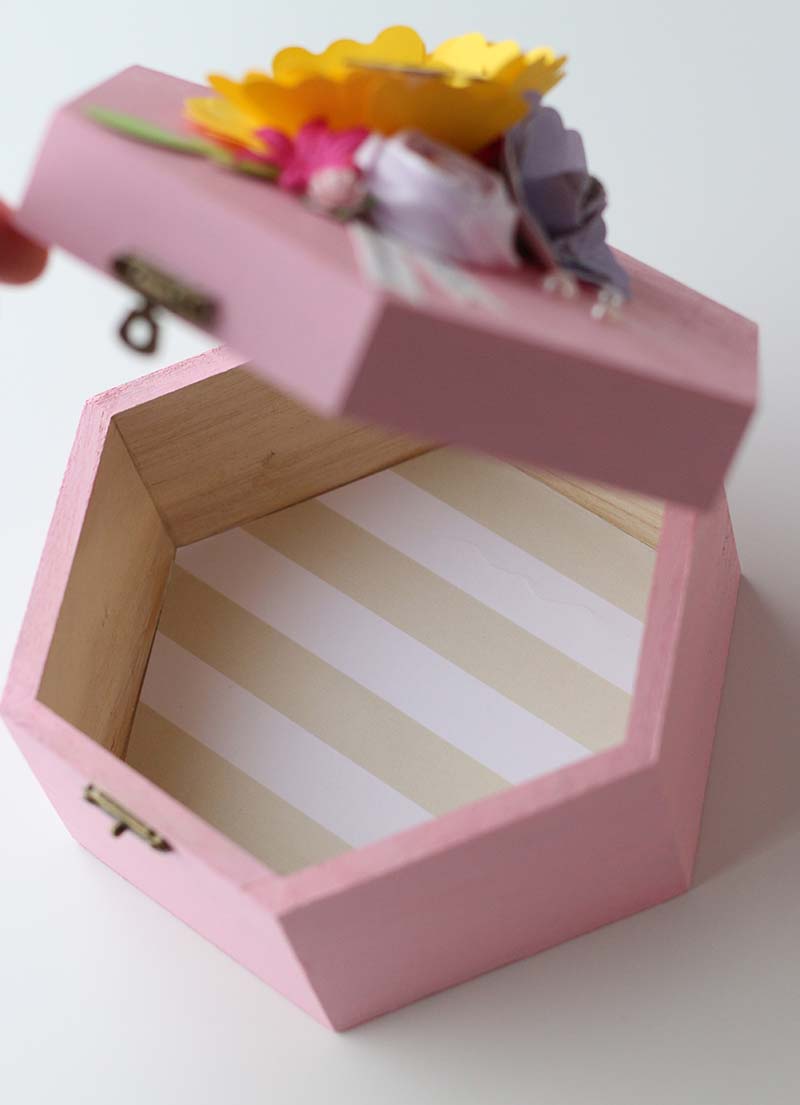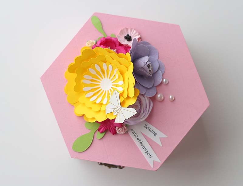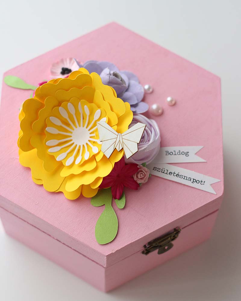 The hobby stores are full of better and better plain wooden boxes. I chose one of them and painted it with matte acrylic paint. I glued several, different type of flowers on the top of it. I made the yellow one from paper, and I twisted the lilac one from satin ribbon. My wish was to create a cheerful general effect. In the end I glued a paper from one of the NőiCsizma collections inside of the box.