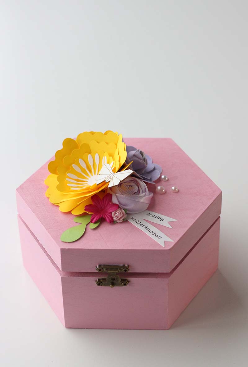 A kreatív boltok tömve vannak a jobbnál jobb nyers fa dobozkákkal. Egy ilyet festettem ki enyhén matt akrilfestékkel. A tetejére több típusú virágot ragasztottam. A sárgát én készítettem papírból, a világos lilát pedig egy vastagabb szatén szalagból csavartam. Szerettem volna egy nagyon vidám összhatást. A doboz belsejébe pedig az egyik kedvenc NőiCsizmás papírkollekcióm egyik darabját ragasztottam.