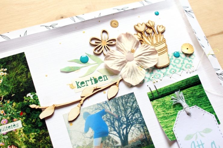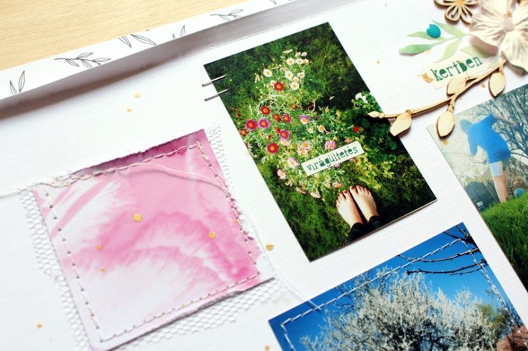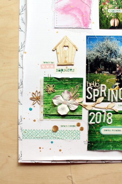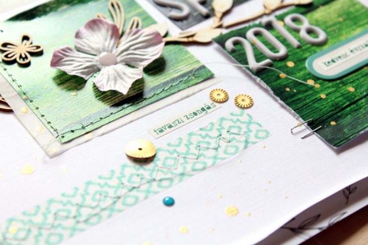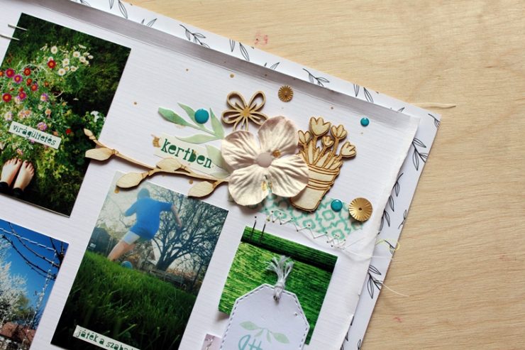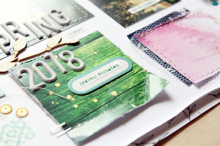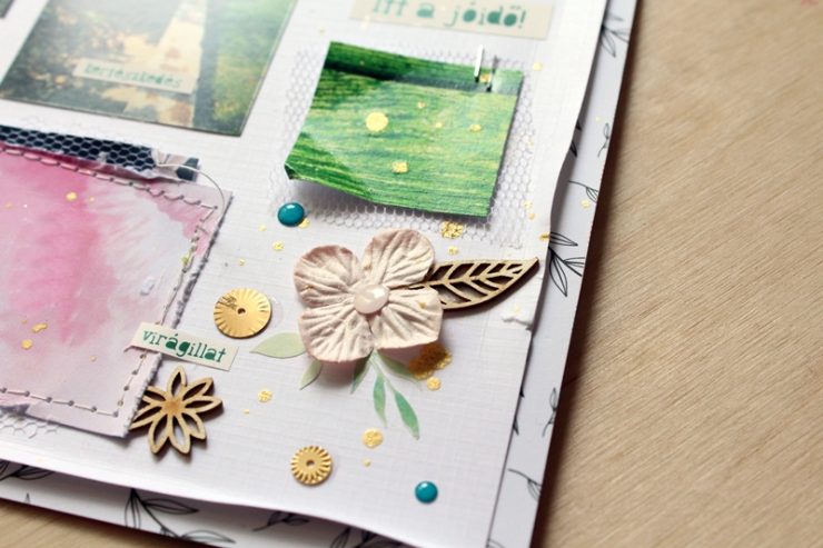 Technikailag nem nagyon akad sok mesélnivaló erről az oldalról, semmi extra nincsen rajta ugyanis. A papírokból négyzeteket, téglalapokat vágtam, elrendezgettem a fotóimmal, csak úgy tessék-lássék, semmi komoly szerkesztgetés, aztán némelyiket le is varrtam, meg is gyűrögettem, csak hogy legyen egy kis plusz textúra az oldalon. Kb ennyi. Gyorsan kész lett, kikapcsolódtam közben, kell ennél több, ha az embernek van szabad fél órája késő este? 🙂