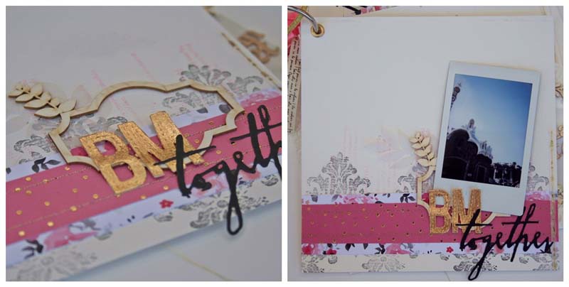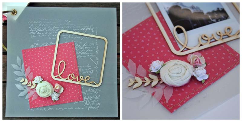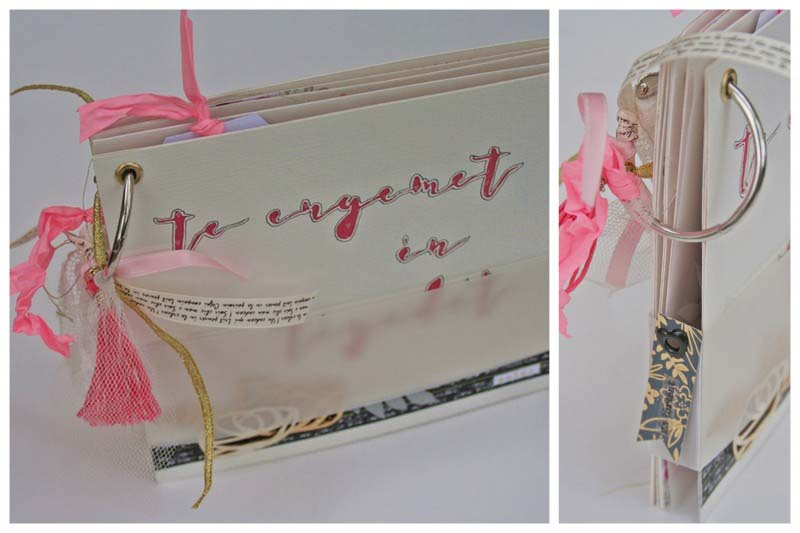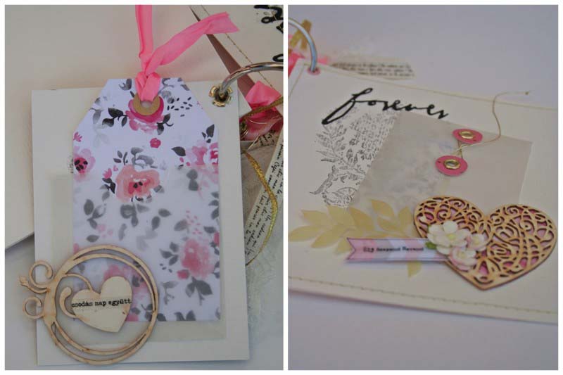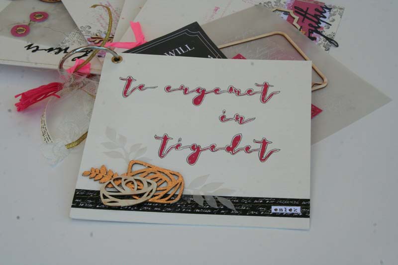 Alapnak tört fehér színű kartont használatam, amit pecsételéssel, varrással és a Ceate Paper Hello Love, valamint a My Mind’s Eye on trend2 készlet papírjaival díszítettem. A chipboardokat néhol füst fóliával borítottam, ezzel még ünnepélyesebbé téve az albumot. A borítón a virágot egy kis darab megmaradt rózsás backgroundból vágtam ki. A népdalból kiragadott részletet és a végén az amerikai borítékot Silhouettel vágtam. A fotók helyére előre beragasztottam a kétoldalú ragasztót, hogy egyértelmű legyen, hova kerülnek a képek. Az albumgyűrű miatt minden oldalt szegeccsel tettem strapabíróbbá. Az albumgyűrűre hímzőcérnából készítettem egy bojtot, és mindenféle szalagokat, csipkét, tüll csíkot kötöttem rá, ami szerintem nagyon feldobta a végeredményt.