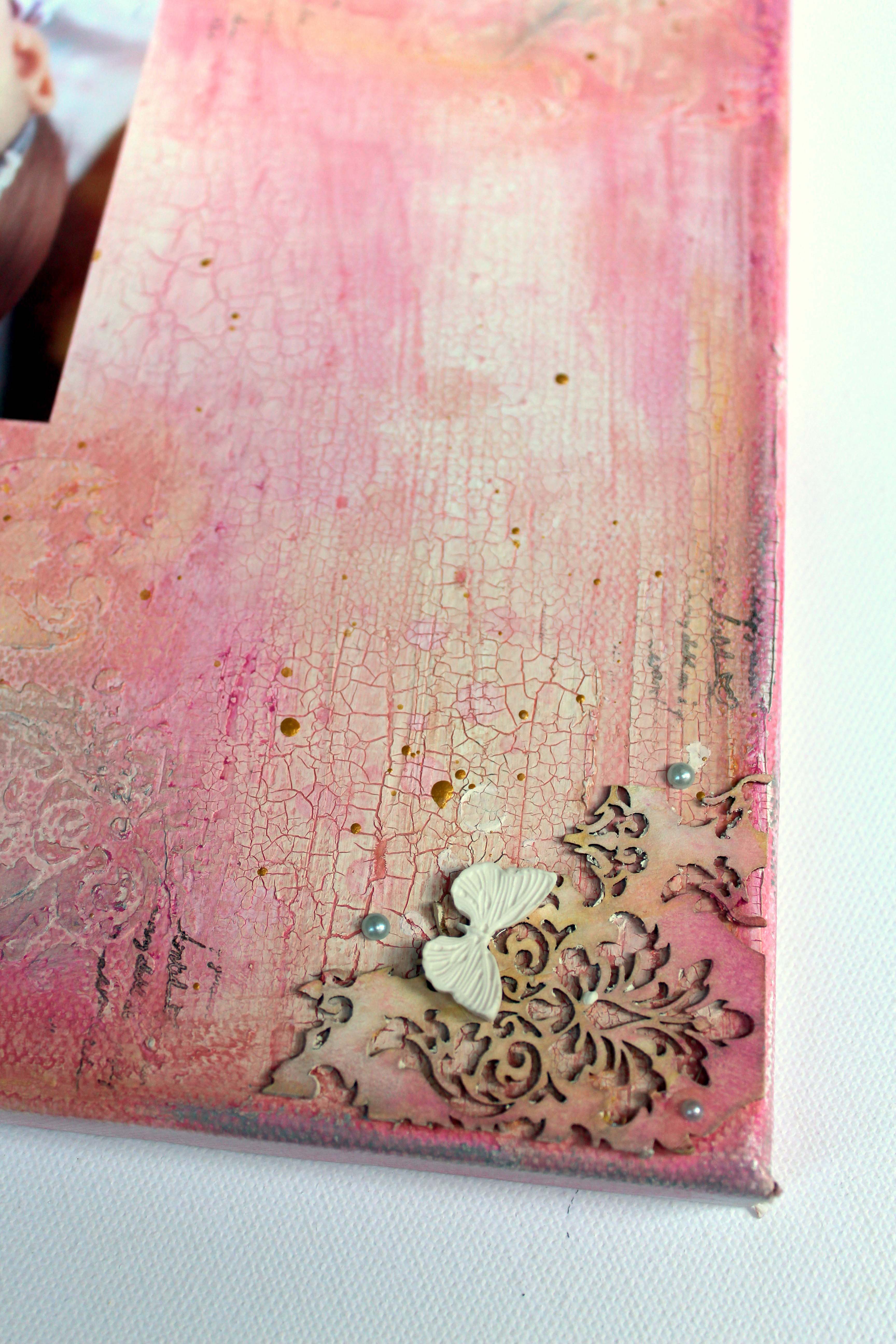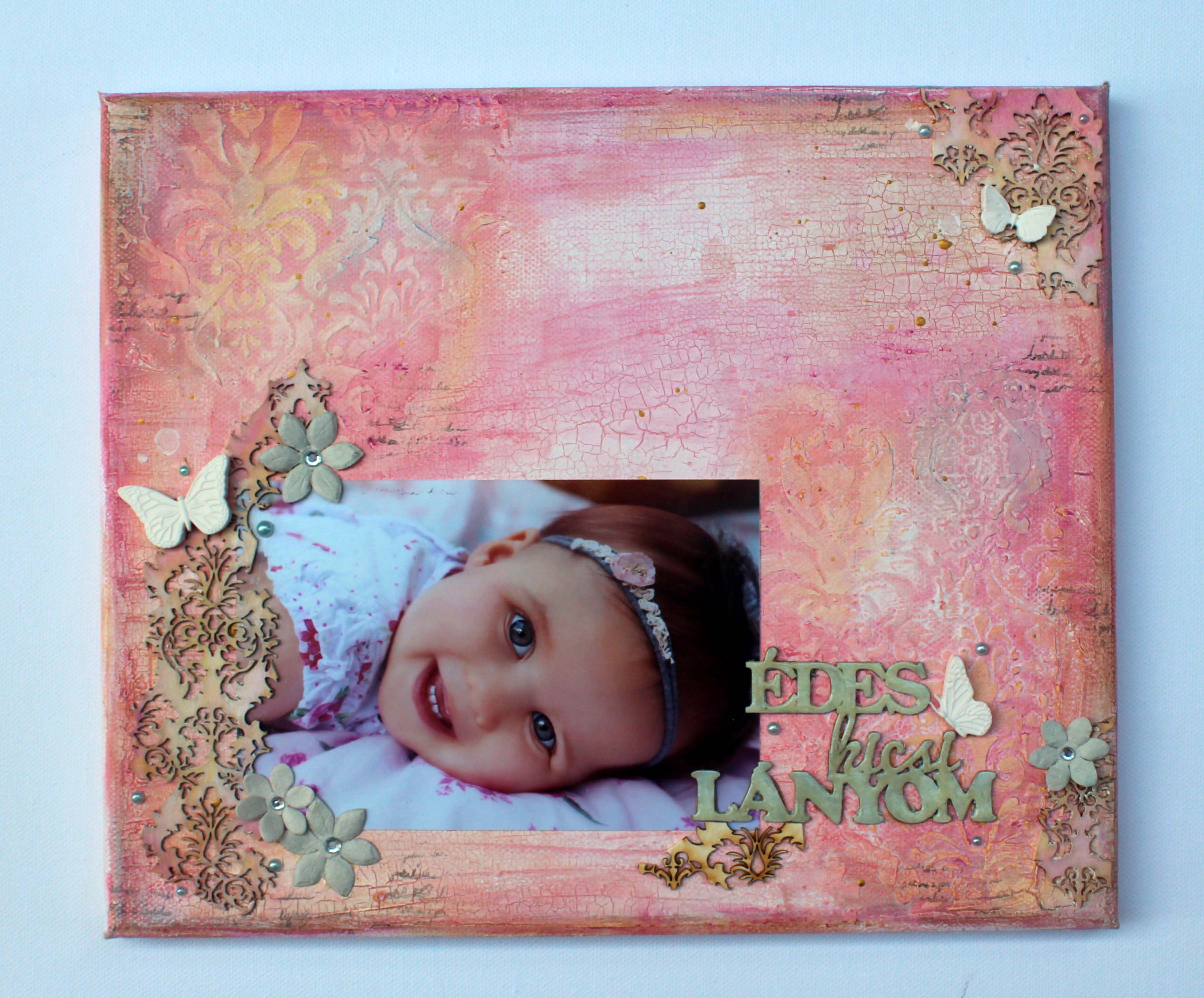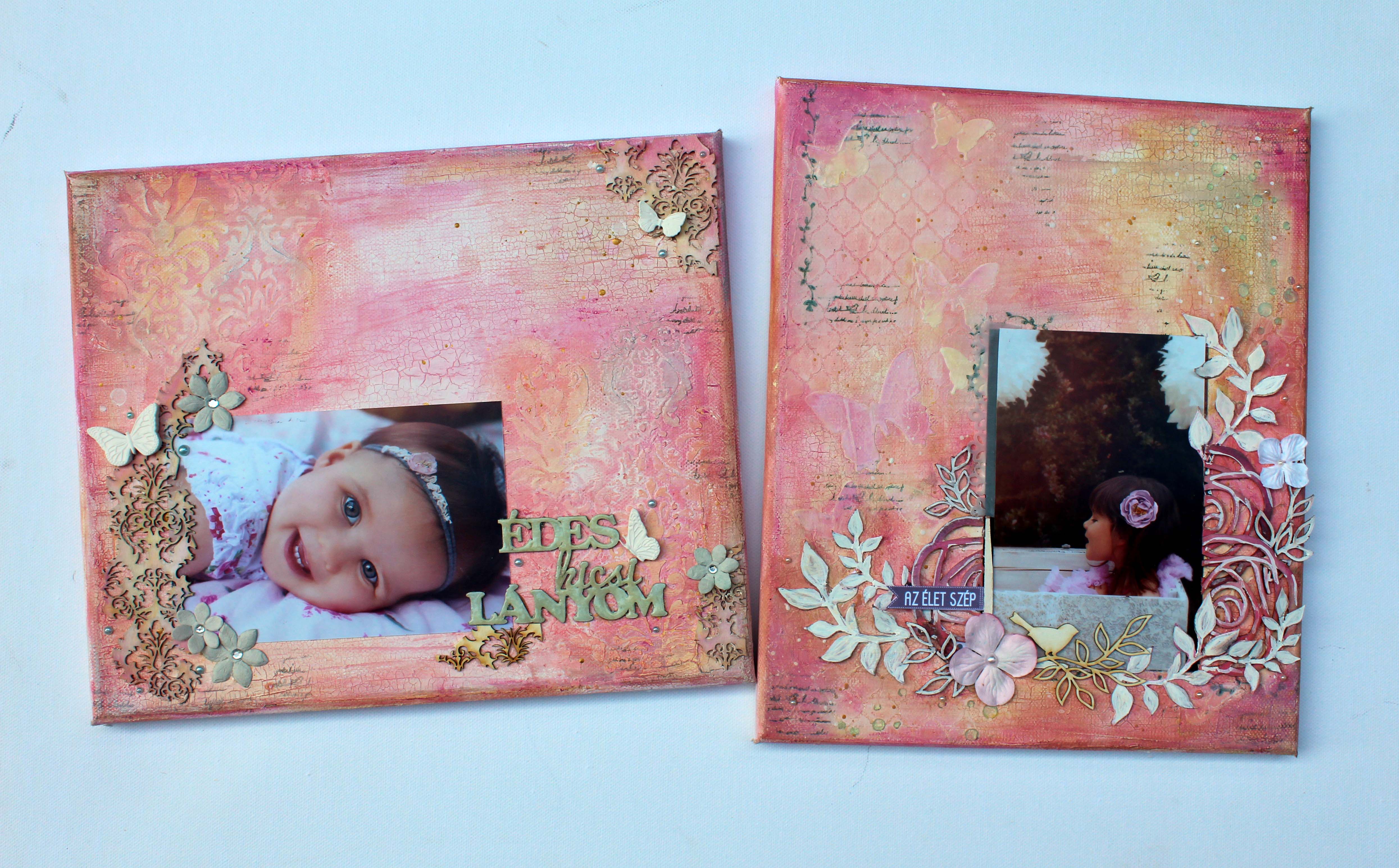 Egy kedves kézműves ismerősöm, Barbi még tavaly kért meg, hogy csináljak vásznat a kislányai képeiből. Teljesen szabadkezet kaptam, ami egyfelelől nagyon klassz érzés, másfelől azért nagy terhet is tesz az emberre. Barbi várt elképesztő türelmmel, míg enegem végre megszállt az ihlet. Az ihletett pillanat végre el is érkezet kb egy hónappal ezelőtt és én pikk-pakk összedobtam a két vásznat….vagy legalábbis az alapokat. 🙂 Azt szerettem volna, ha egységet képeznek, azaz egymás mellé rakva is jól mutatnak, de mégsem egyformák. Alapnak repedő pasztát használtam, amit aztán gelatos-val színeztem, a stuktúrákat pedig gessoval hoztam létre.