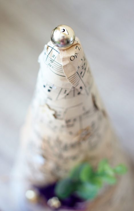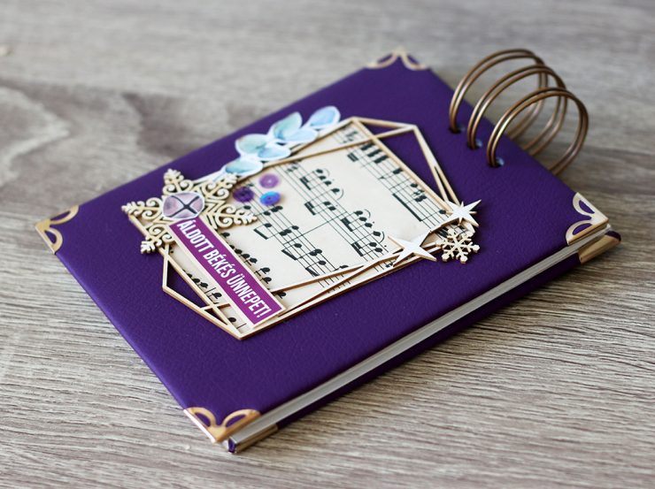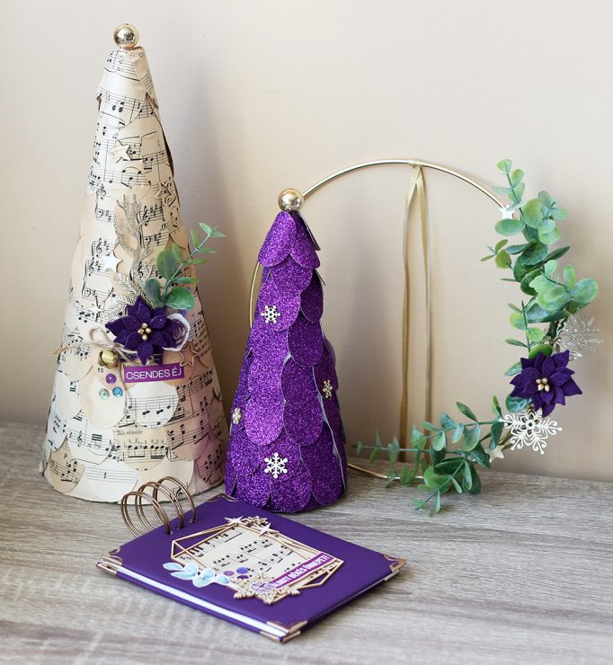 Próbáltam egy kicsit a régi kottapapírral antik hatást kelteni. A hungarocell kúpokat minimálisan díszítettem, ahogyan az ajtódísz aranyozott karikája is csak egy kevés eukaliptusz ágat, chipboard-ot és általam készített filc virágot kapott. Idén is készül fényképalbum a nagyszülőknek, ahogy tavaly is, így a tetxilbőrrel borított spirálos album az egyikőjük ajándéka lesz.