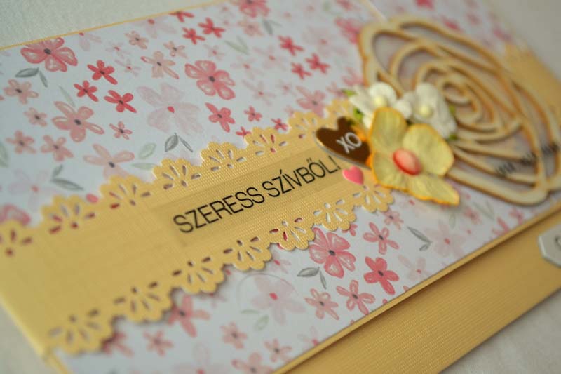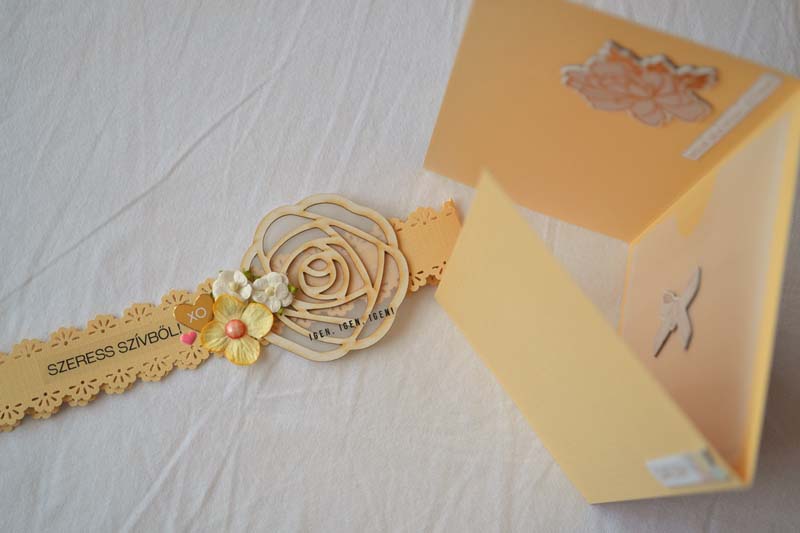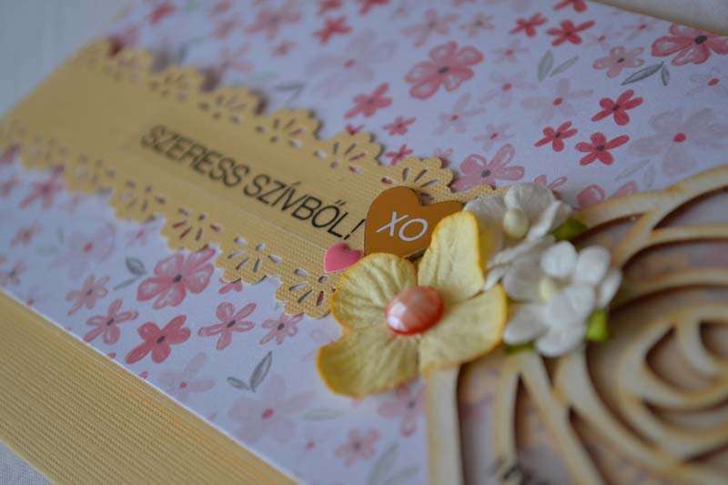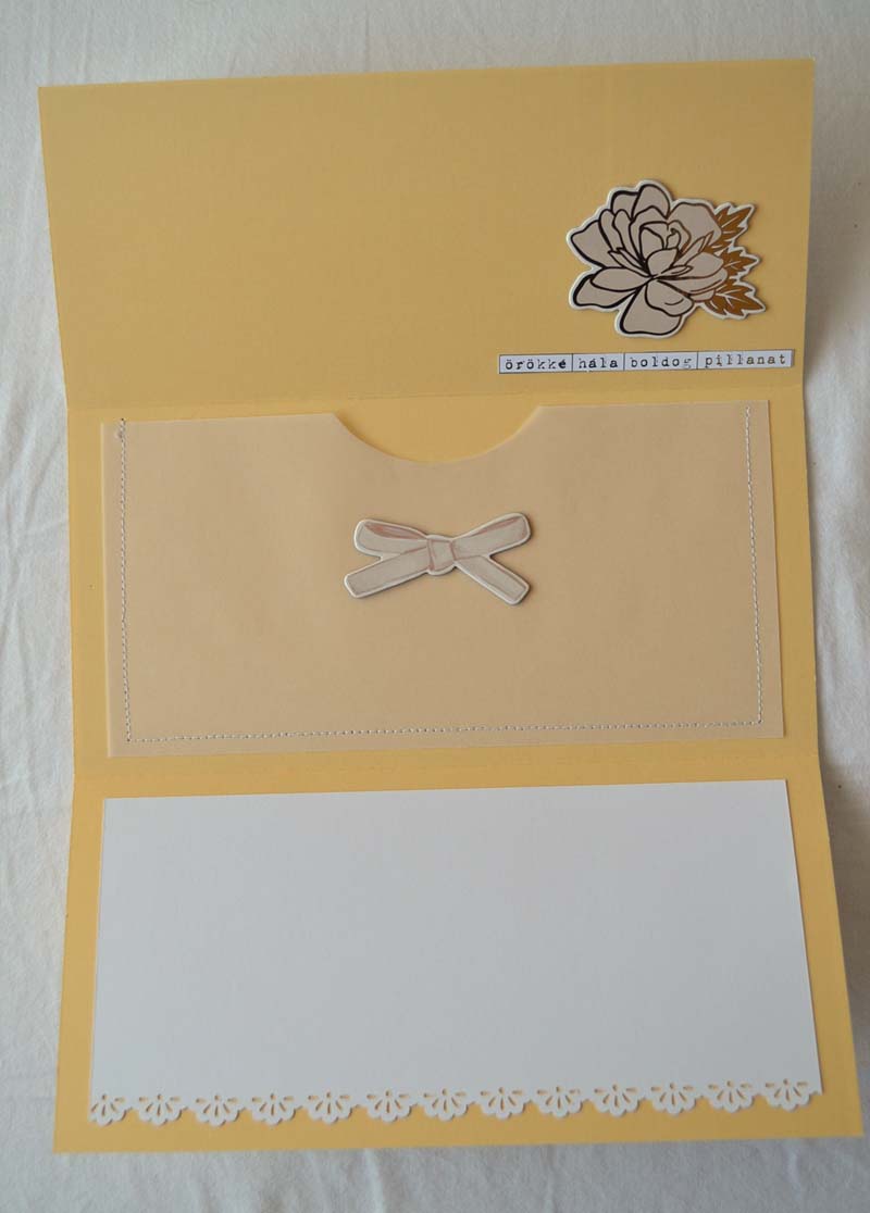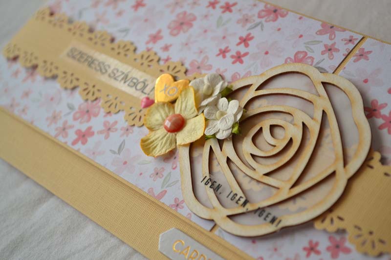 A boríték egy alapkartonból áll, amelyet három különböző részre bígeltem, majd azt behajtogattam. A pénz helyének számtalan variációja lehet, én most a középső részre képzeltem el, amelyet pauszból az alapkartonhoz varrtam. Innen tuti nem esik majd ki az ajándék, gondoltam magamban. Az alsó részére fehér papírt ragasztottam, amelyre majd mehet a jókívánság, személyes üzenet (mégiscsak tudja az ifjú pár, hogy kitől is kapta az ezreseket 😉 ). A borítékot egy hosszú papírcsíkkal lehet lezárni, amelyet bordűrlyukasztóztam, hogy elegánsabb legyen. Ez könnyen lehúzható róla, így ezt a részét díszítettem. A nagy rózsa csipi alá pauszpapírt ragasztottam, hogy legyen tartása a csipinek, majd erre ment néhány virág, félgyöngy, és természetesen az átlátszó matricából is került rá, mert ez olyan kis plusz, amivel nagyon jól fel lehet dobni szinte bármit, ezzel személyessé téve az ajándékot.