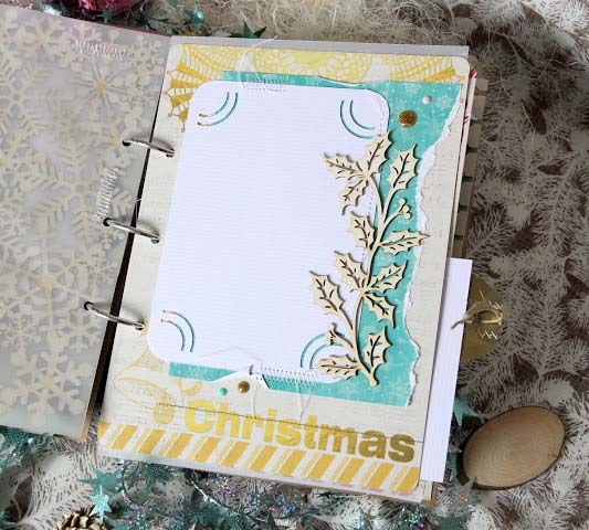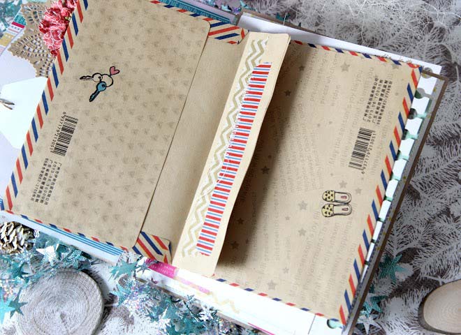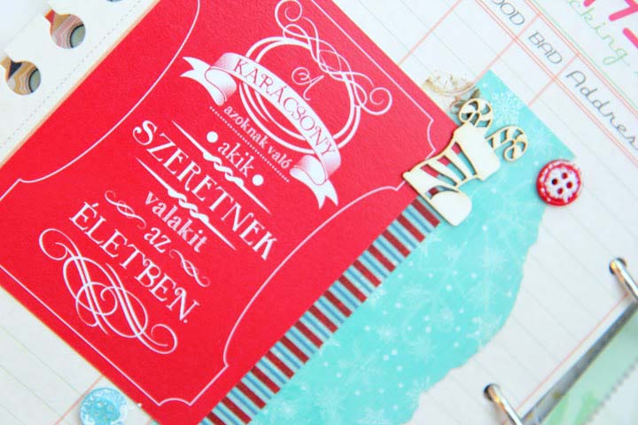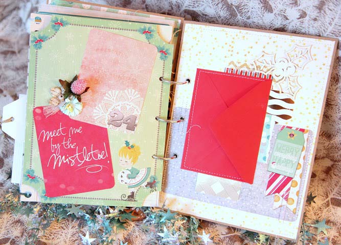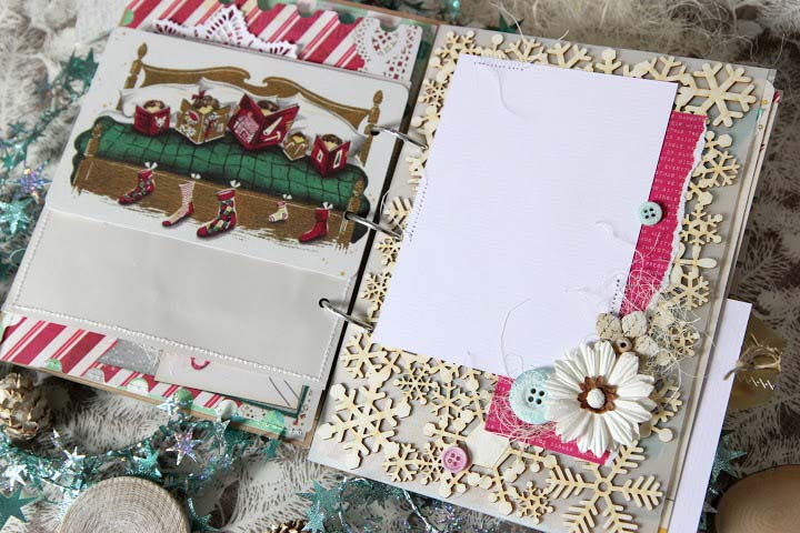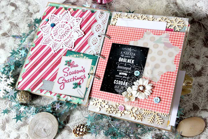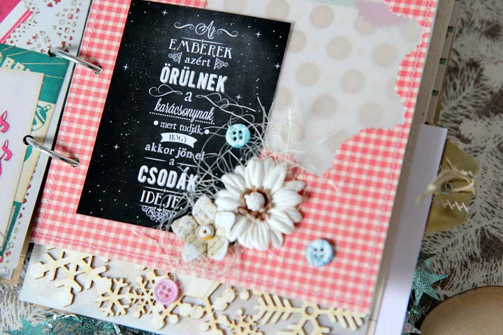 Nincs sok díszítés benne, mert elég csak pár csodalatos karácsonyi NCSD chipboard, karácsonyi NCSD kártyák és már egyedi szép az oldal!!! Ebben az albumban nem is dekoráltam a csipiket, mert így natúr nagyon szépek. Csak egy kis varrás itt-ott, dekortapasz, kis virágok, gombok, szizál, pauszpapírok. Bele tettem két kraft borítékot, hogy lehessen tárolni is valami kis karácsonyi emlékrt,( pl. jegyeket)