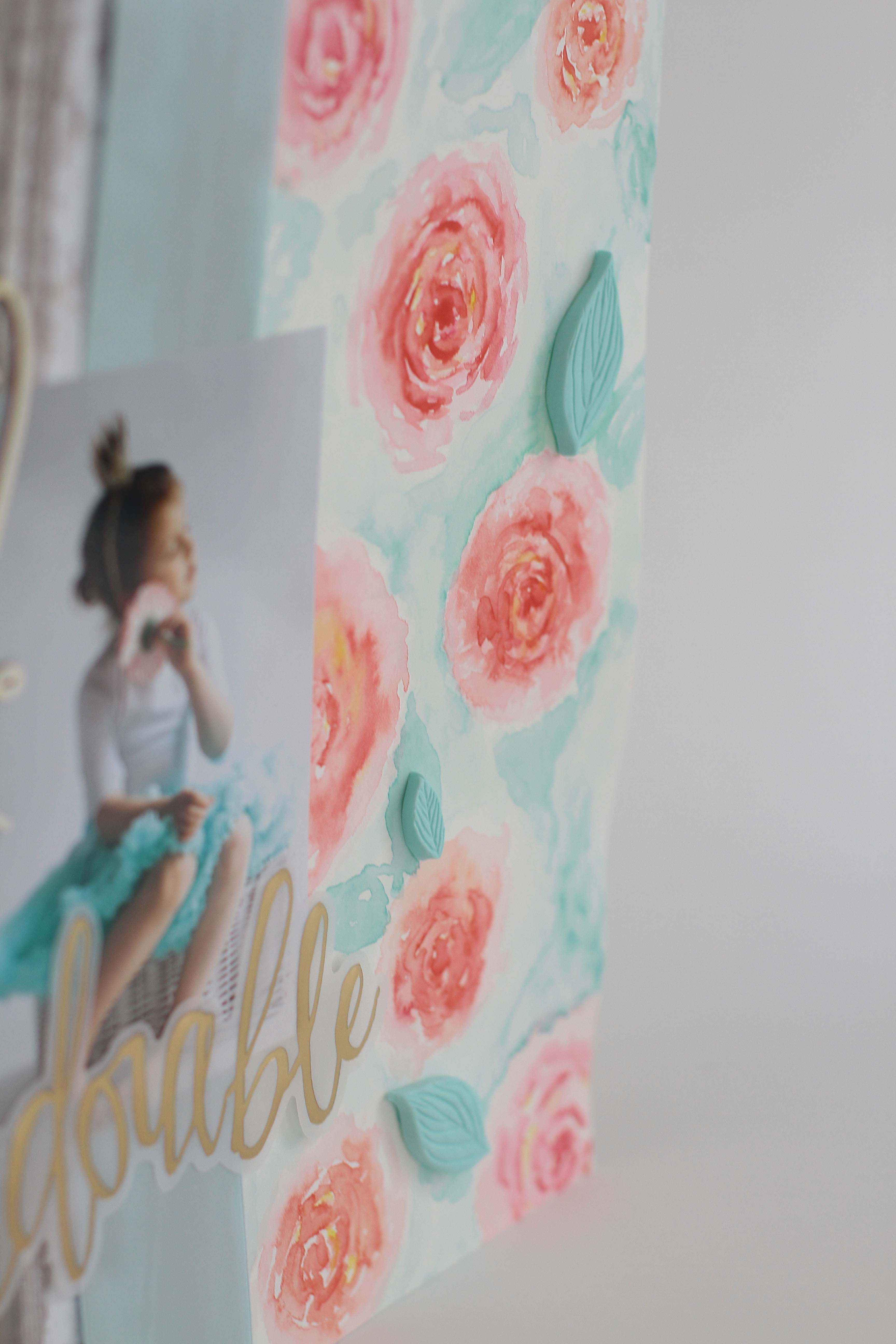 Egy igazán egyszerű oldal az én egyik virágszálamról. A fotón szereplő személyen kívül 🙂 az oldal különlegessége – ha lehet így mondanom -, hogy a rózsákat magam festettem vízfestékkel. Akvarell papírra dolgoztam. A rózsák elmosódott leveleit néhol gyurmadísszel tettem hangsúlyosabbá. A deszkás és az sk. papír „elválasztásához” vastag szatén szalagot használtam.