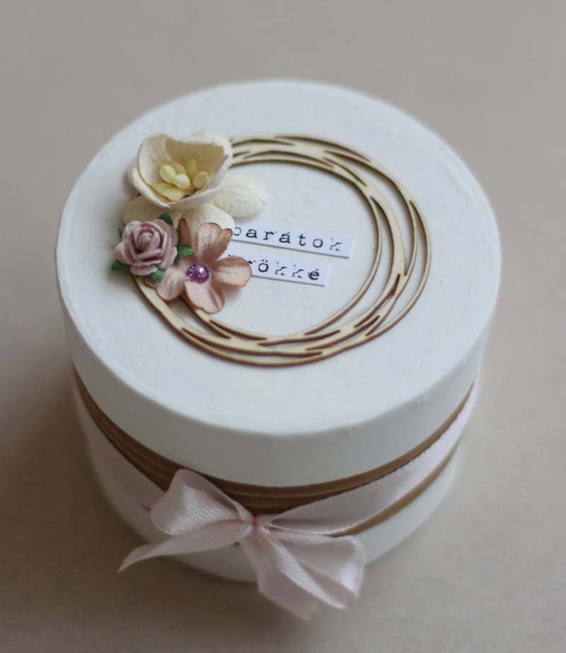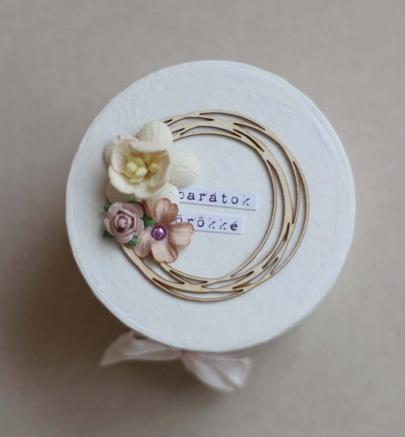 Egy nyers, festetlen papírmasé dobozkát díszítettem fel. A kör alakú chipboard, a papírvirágok és a PL szócímkék egy különleges, kissé szentimentalista összhatást eredményeztek. Régi barátság a miénk, így szerettem volna kifejezni, hogy mennyire fontos is ő nekem!