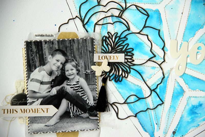 Több kedvenc momentumom is van most a scrap-ben: festegetés, a varrás, a keresztszemes, a bojtok, a nagy csipik, az akvarell papír. Ezen az oldalon most szinte mindet fel is használtam.