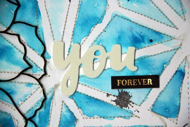 Először az akvarell papíron körberajzoltam a nagy geometrikus szív csipit és kifestettem. Úgy terveztem, hogy a csipit magát is használni fogom az oldalon, aztán mégis inkább a varrást választottam. Ez az ötlet egy sugallatként jött. Azt is tudtam, hogy melyik fotóhoz használom majd.  Amikor viszont eddig eljutottam, elkezdődött a szenvedés. Tologattam ide-oda, erre-arra a képet, nem találtam a helyét. Több estém is ráment a szerencsétlenkedésemre, de egyhelyben toporogtam, fogva tartott a kiinduló ötlet.  Majd Editet zargattam tanácsért és ő kilendített a gondolataimból.
